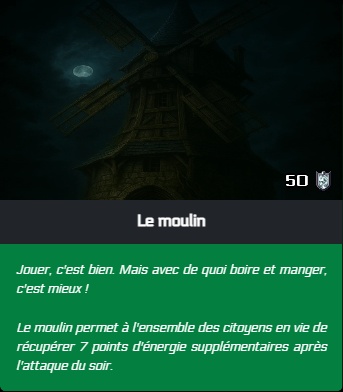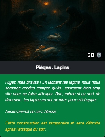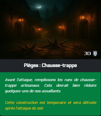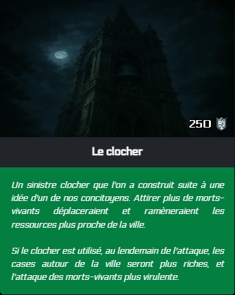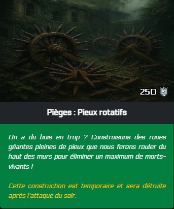 - Il est maintenant possible d'affecter les survivants aux chantiers. Si un chantier est terminé par les survivants lors de l'attaque du soir, les points de défenses sont ajoutés à la ville avant l'attaque.