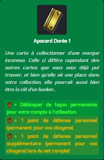 Autrement, il nous faut accueillir 4 nouvelles Apocards "end-game" ! La collection "dorée" a la particularité de ne posséder que 4 cartes, mais chacune d'elle offre 1 point de défense immédiat, et le set donne 1 point de défense bonus :